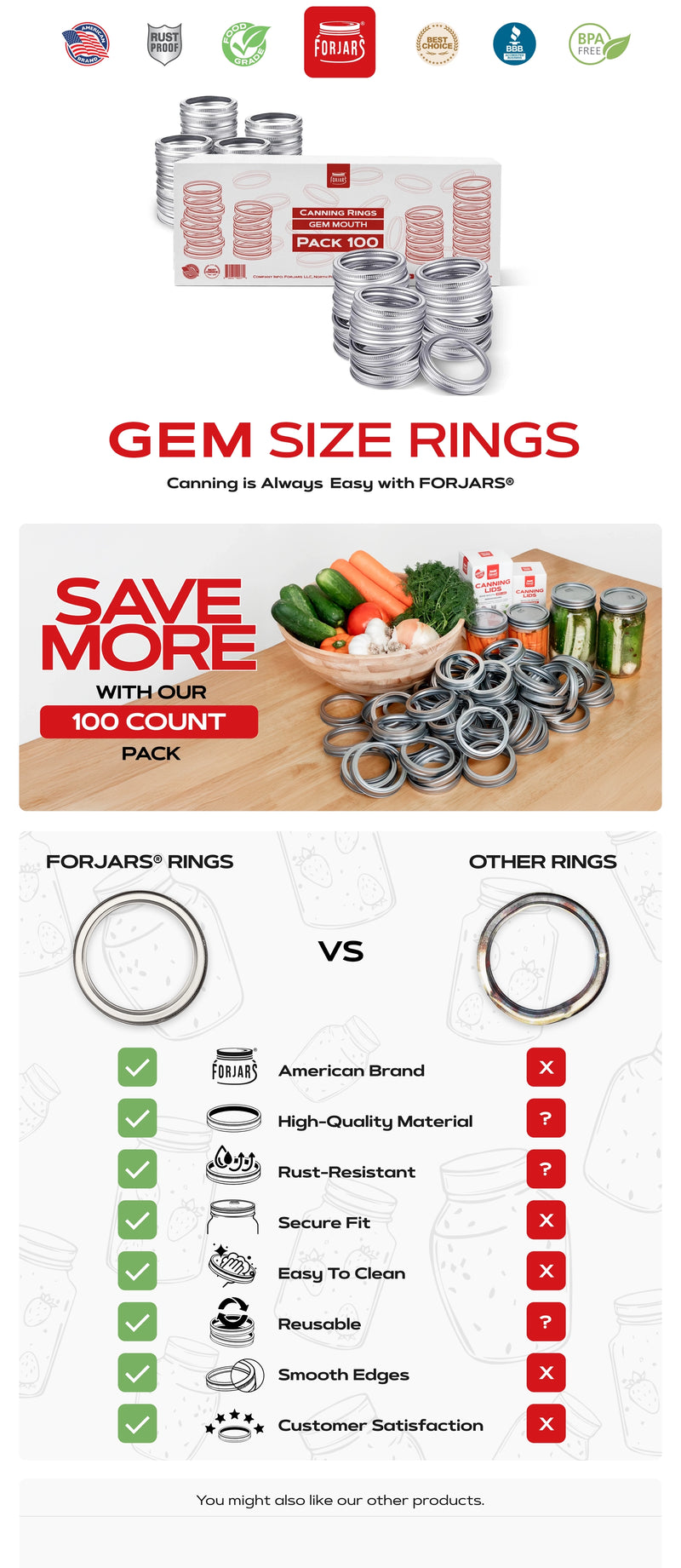 Safe for boiling and pressure cooking, these canning rings will provide a dependable and secure seal for all your canning needs. From salsa, and pickles, to turkey broth, these Forjars Canning Rings are the affordable alternative you have been looking for all this time. Well, search no more! Order today and discover why these canning rings are recommended by expert canners all over Canada and the USA.