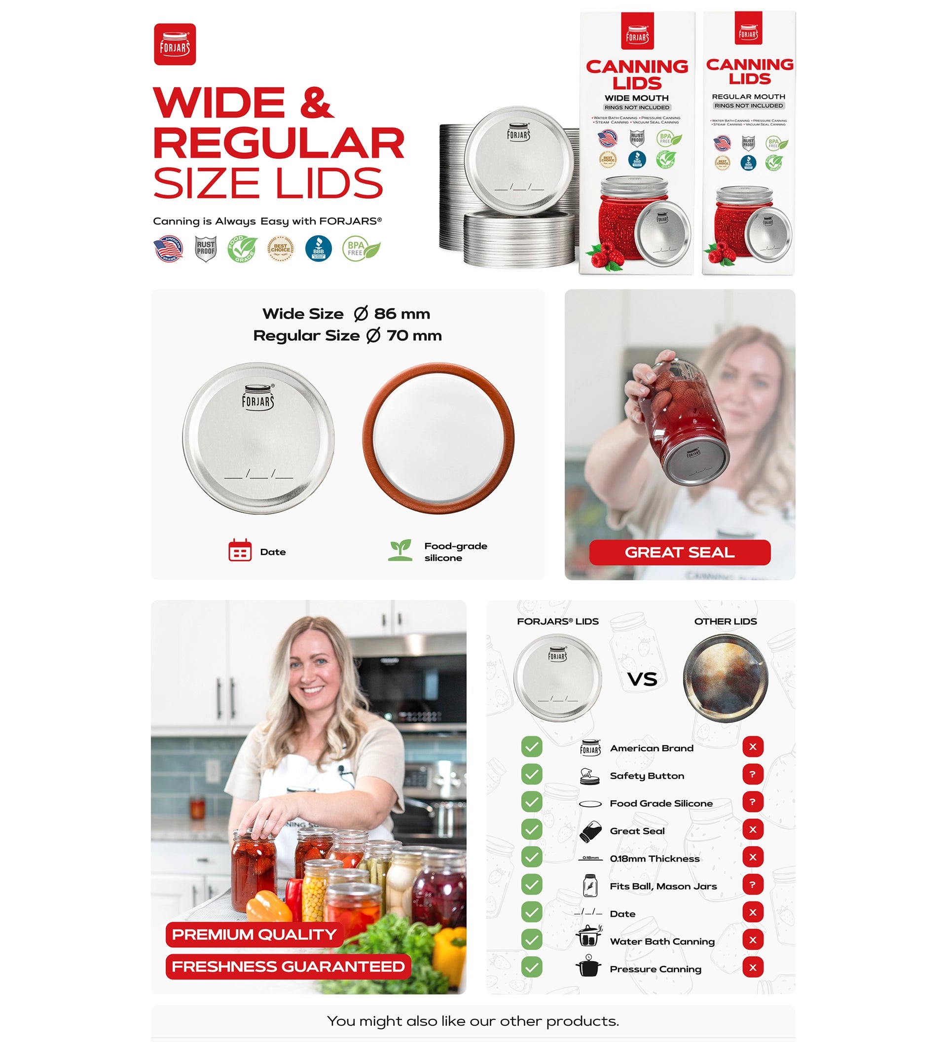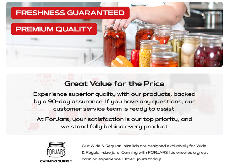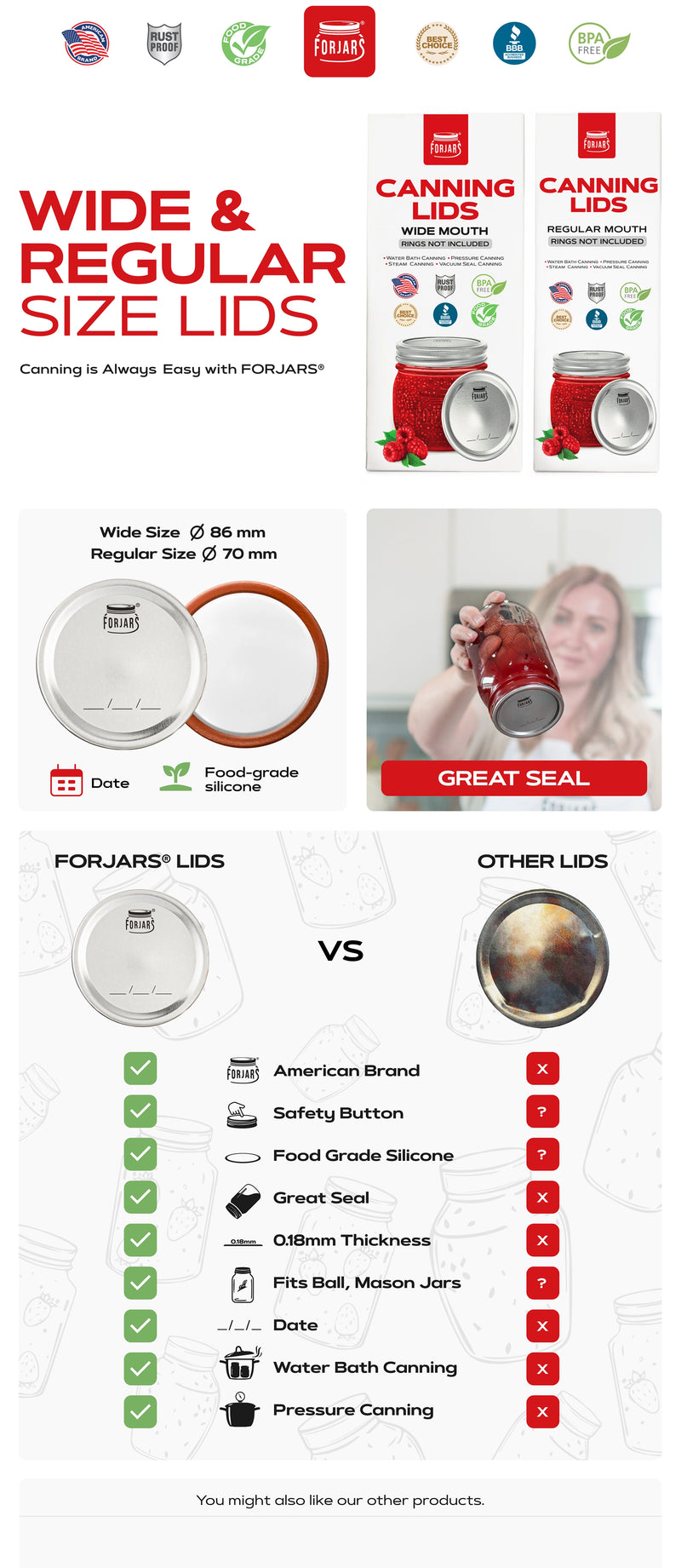 Safe for boiling and pressure cooking, these canning lids will provide dependable and safe seals for all your canning needs. From salsa, pickles, to turkey broth, these Forjars Canning Lids are the affordable alternative you have been looking for all this time. Well search no more! Order today and discover for yourself why these canning lids are recommended by expert canners all over the USA.